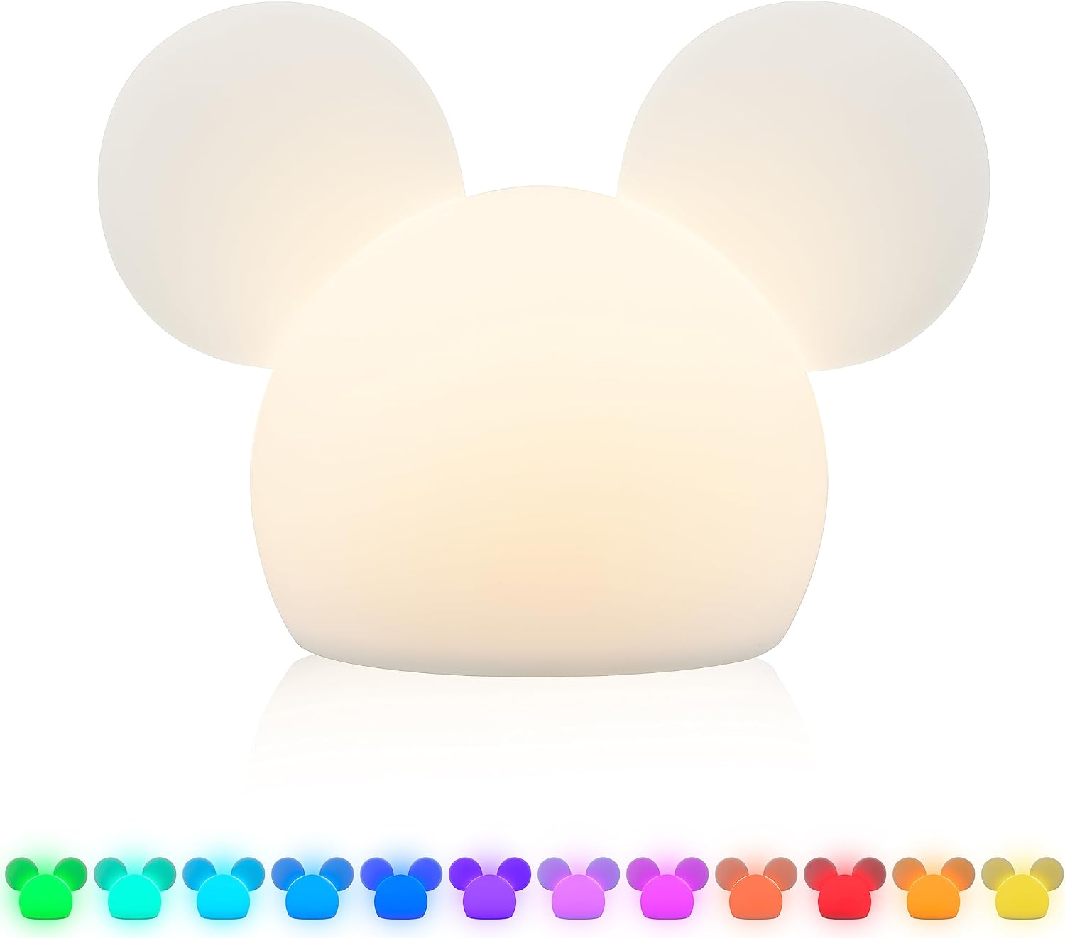 Light your space with Disney's Mickey Mouse Color-Changing Squishy Light! Featuring the iconic outline of Mickey's ears, this soft and squeezable light is perfect for any fan of the famous mouse. Great as a table lamp in living rooms, a night light in bedrooms or as just as a charming accent light, you can choose from a variety of colorful modes. Simply tap the light's soft silicone design to switch between 13 bright LED colors, including dimmable white light, plus an automatic color-fade mode. There are two ways to power the squishy light – the included 2ft. USB-C cable and 3 AAA batteries (not included). Using the USB-C cable (5V, 1A USB-A adapter required) provides a streamlined, energy-efficient way to keep your space lit. Using batteries lets you take Mickey with you on the go – and is ideal when the power goes out. Created to last, cool to the touch and certified for safety, this light is designed for your peace of mind. Bright colors, fun modes, magical charm – Disney's Mickey Mouse Color-Changing Squishy Light.